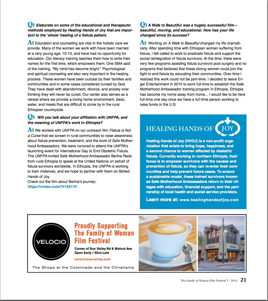 A: Working on A Walk to Beautiful changed my life dramatically. After spending time with Ethiopian women suffering from fistula, I felt called to work to eradicate fistula and support the social reintegration of fistula survivors. At the time, there were very few programs assisting fistula survivors-post surgery and no programs that believed that these strong women could join the fight to end fistula by educating their communities. Over time I realized this work could not be part-time. I decided to leave Engel Entertainment in 2010 to work full-time to establish the Safe Motherhood Ambassador training program in Ethiopia. Ethiopia has become my home away from home...i would like to be here full-time one day once we have a full-time fundraiser to help us in the US.