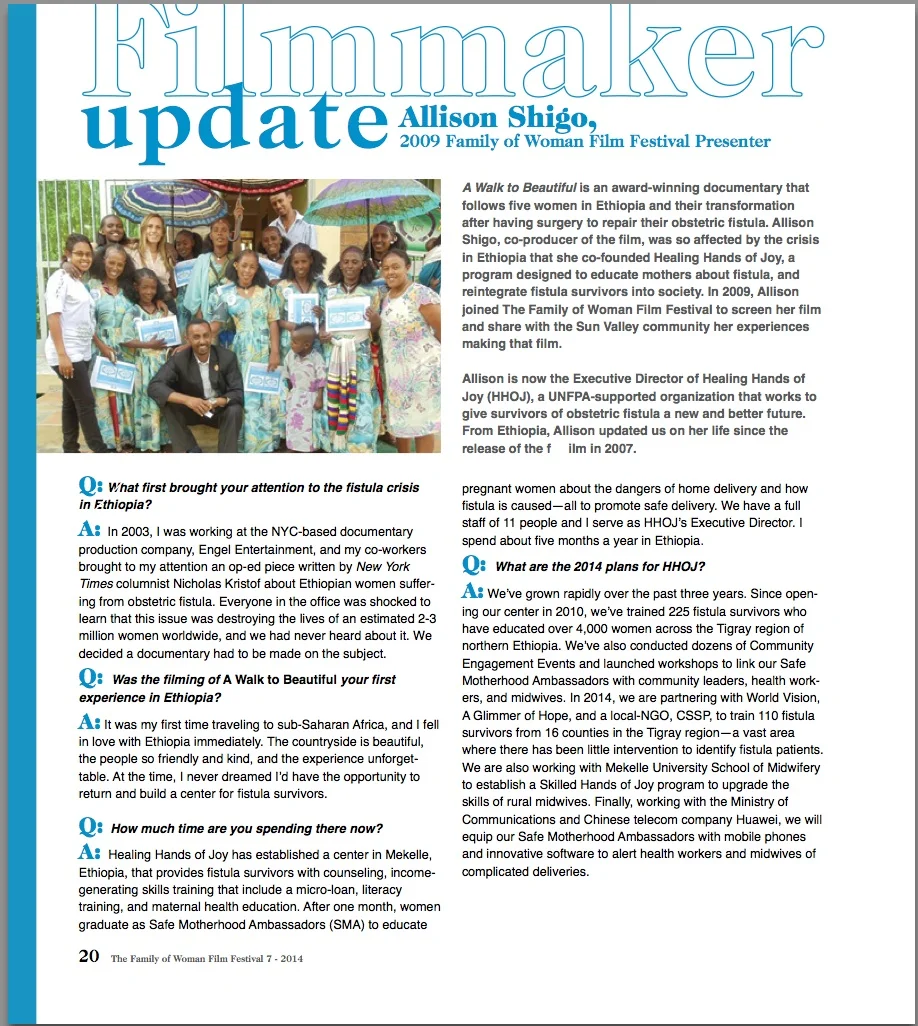 A Walk to Beautiful is an award winning documentary that follows five women in Ethiopia and their transformation after having surgery to repair their obstetric fistula. Allison Shigo, coproducer of the film, was so affected by the crisis in Ethiopia that she co-founded Healing Hands of Joy, a program designed to educate mothers about fistula, and reintegrate fistula survivors into society. She is now the Executive Director of HHOJ, determined to give survivors of obstetric fistula a new and better future. Communicating from Ethiopia, Allison updated us on her life since the release of the film in 2007.